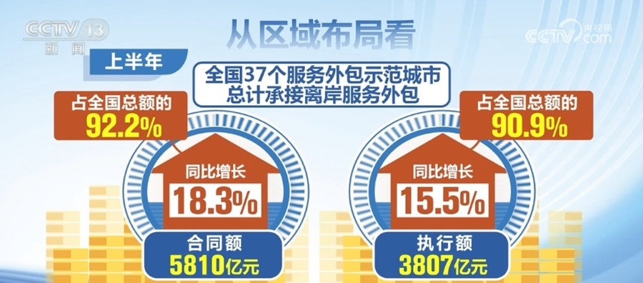 從區(qū)域布局看,上半年,全國37個服務(wù)外包示范城市總計承接離岸服務(wù)外包合同額5810億元,執(zhí)行額3807億元,同比分別增長18.3%和15.5%,分別占全國總額的92.2%和90.9%。