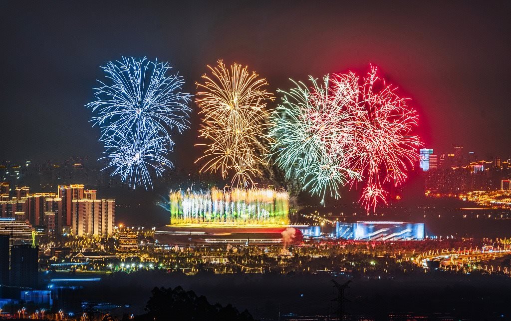 △2023年7月18日,成都大運(yùn)會(huì)開幕式第一次帶焰火彩排。