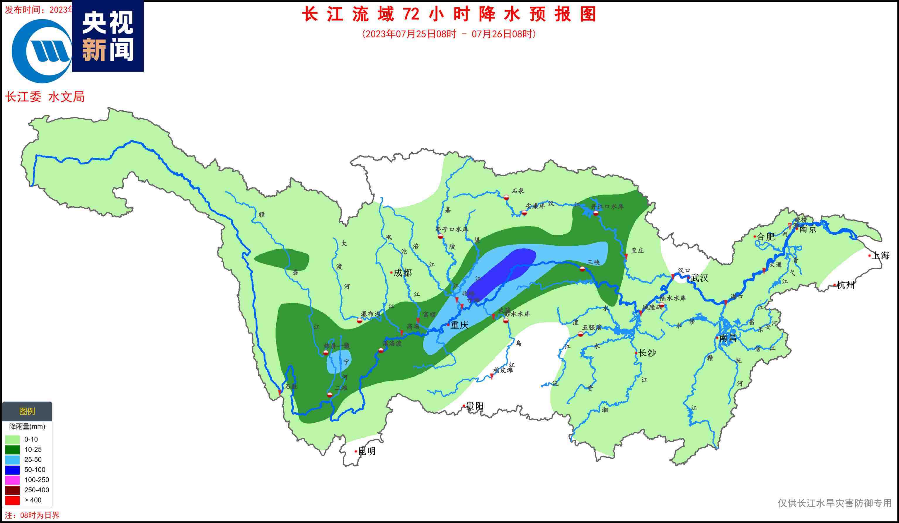 據(jù)水文氣象預(yù)報(bào),7月23日,嘉岷流域北部有中雨、局地大雨;24~27日,長(zhǎng)江上游干流附近有中到大雨、局地暴雨的降水過(guò)程,過(guò)程累計(jì)面雨量:長(zhǎng)江上游干流70毫米,金沙江中下游、雅礱江、岷沱江、渠江、烏江上游30~50毫米??紤]預(yù)見(jiàn)期降雨,金沙江中下游、嘉岷流域、赤水河、烏江、三峽區(qū)間將發(fā)生漲水過(guò)程,降雨落區(qū)內(nèi)部分中小河流可能發(fā)生超警洪水,局部強(qiáng)降雨引發(fā)山洪災(zāi)害的風(fēng)險(xiǎn)高。