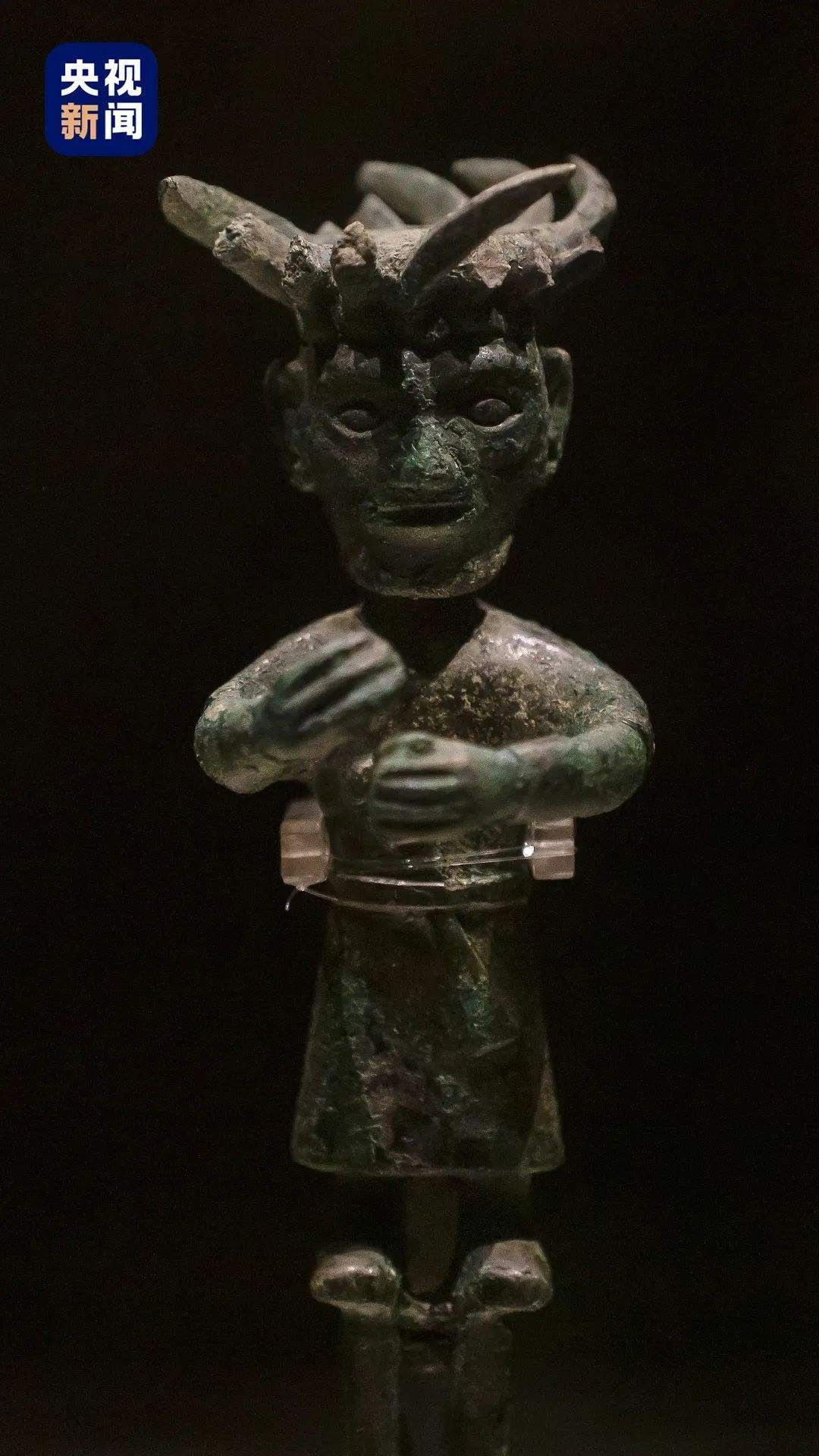 △金沙遺址銅立人。銅立人頭上的渦形帽圈與“太陽(yáng)神鳥”的太陽(yáng)圖案相似,象征光芒四射的太陽(yáng)。