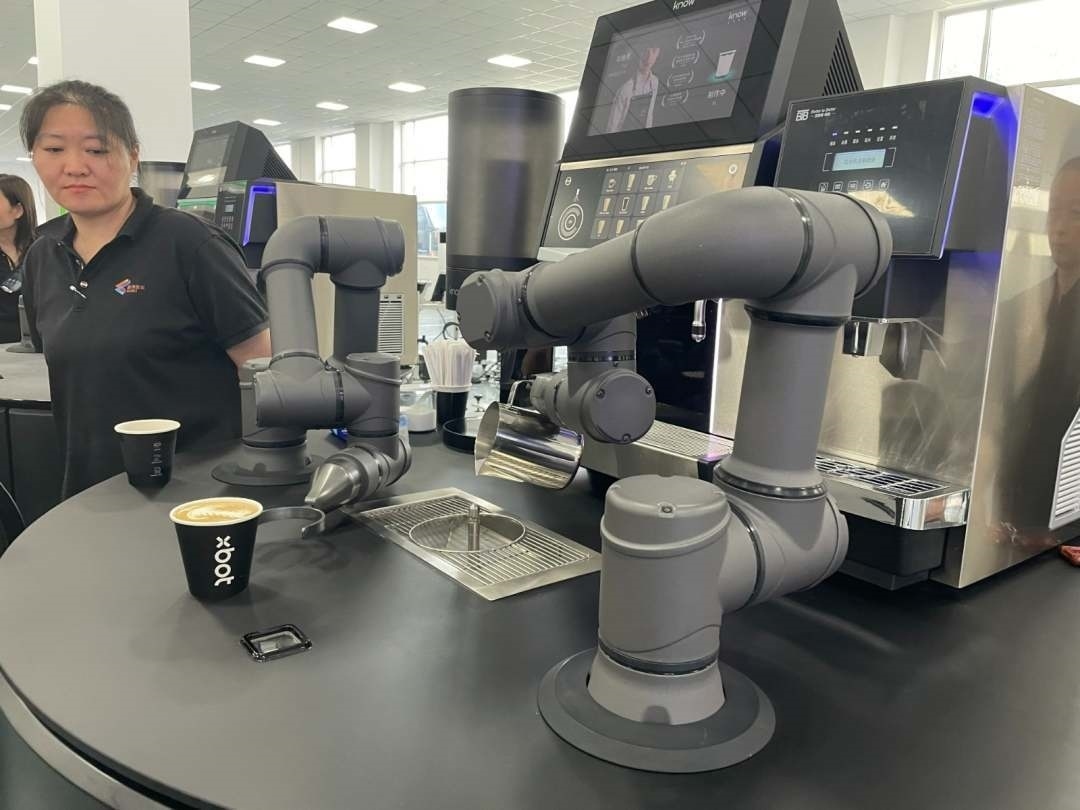 遨博(山東)智能機(jī)器人有限公司的六軸協(xié)作機(jī)器人,正在演示工業(yè)場(chǎng)景中的模塊組裝
