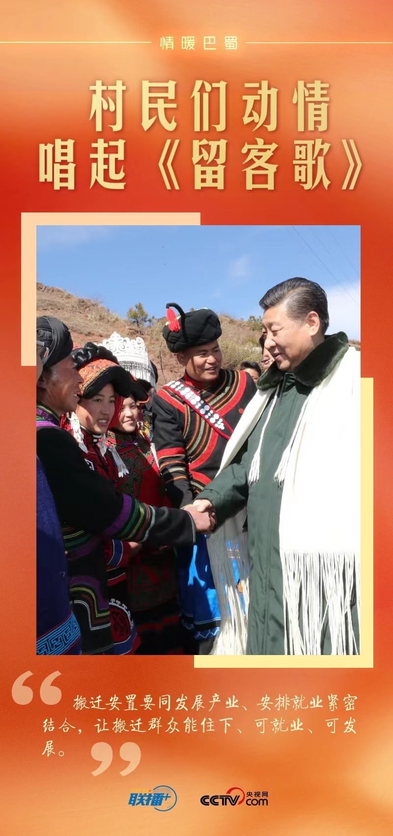 總書記離開村子時(shí),身著彝族盛裝的鄉(xiāng)親們排起長(zhǎng)隊(duì)。村黨支部書記代表全村人向總書記獻(xiàn)上彝族傳統(tǒng)服飾查爾瓦,表達(dá)對(duì)總書記的愛戴之情。人群中有人唱起彝族民歌《留客歌》,鄉(xiāng)親們都跟著唱起來……掌聲、歌聲、歡呼聲在村子里久久回蕩。