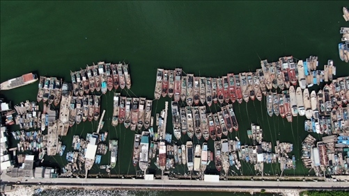7月27日,廣東省潮州市饒平縣三百門(mén)漁港里回港避風(fēng)的漁船(無(wú)人機(jī)照片)。 新華社記者王瑞平攝