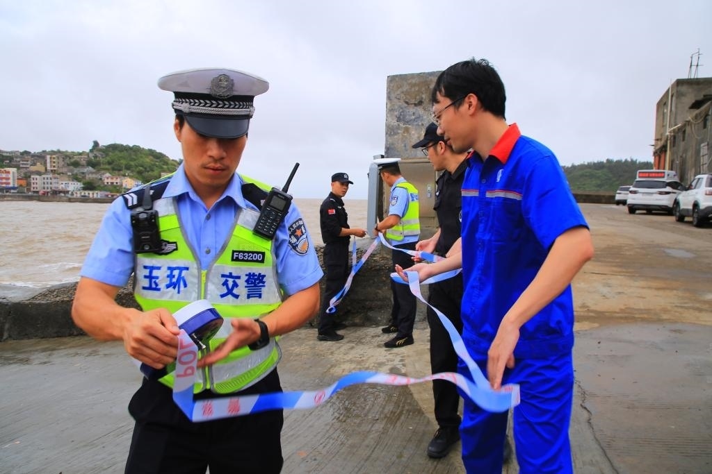 7月27日,民警、交警在浙江省玉環(huán)市應(yīng)東碼頭設(shè)置警戒線(xiàn)。新華社發(fā)(段俊利攝)