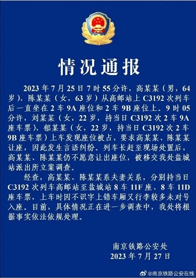 ·兩老人高鐵霸座反罵買票人不要臉,南京警方通報已立案調查。