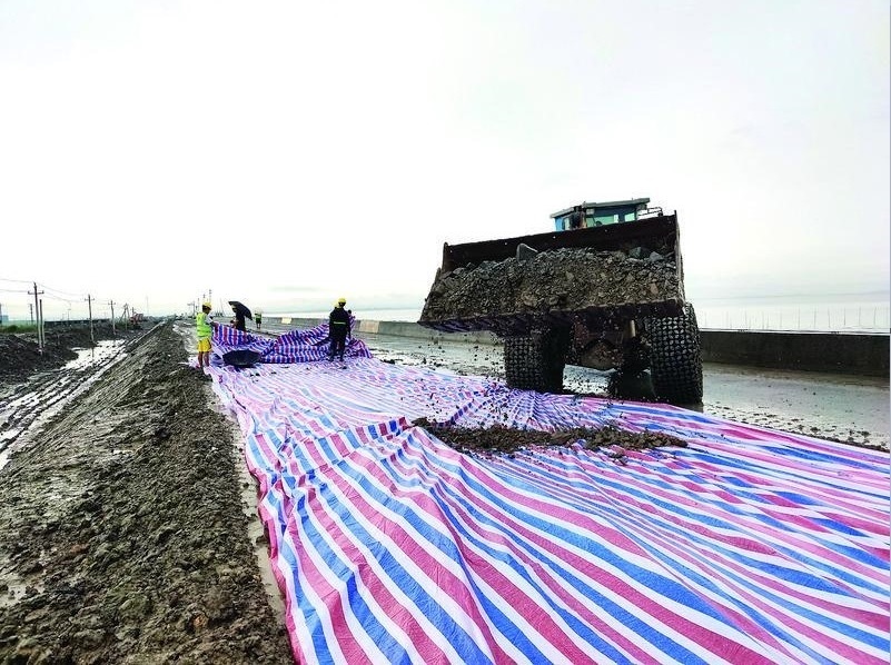 工作人員對(duì)海塘堤壩進(jìn)行加固。(受訪(fǎng)者供圖)
