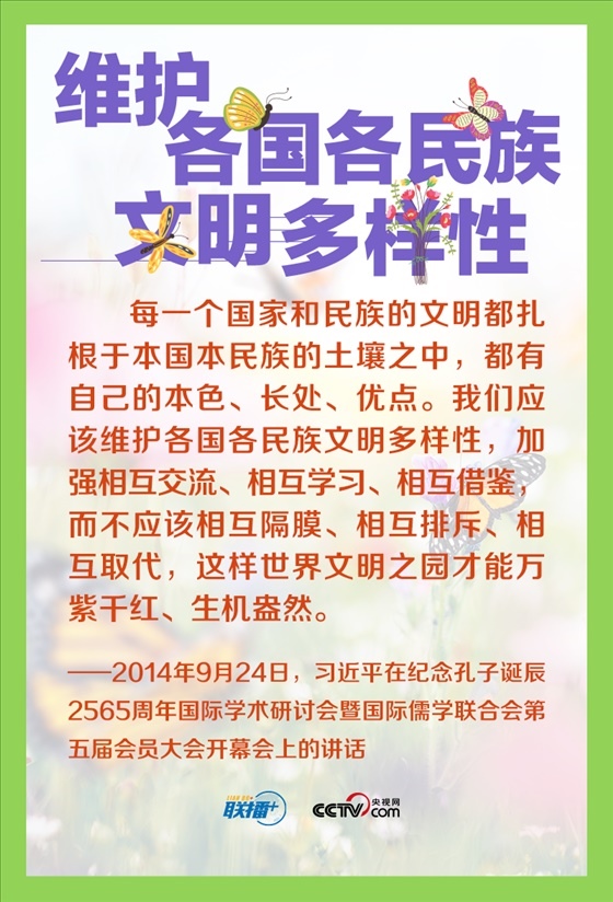 人類文明多樣性賦予這個世界姹紫嫣紅的色彩,多樣帶來交流,交流孕育融合,融合產(chǎn)生進(jìn)步。長期以來,習(xí)近平主席在不同場合多次倡導(dǎo)尊重世界文明多樣性,推動不同文明交流對話、和平共處、和諧共生。讓我們一起來學(xué)習(xí)。