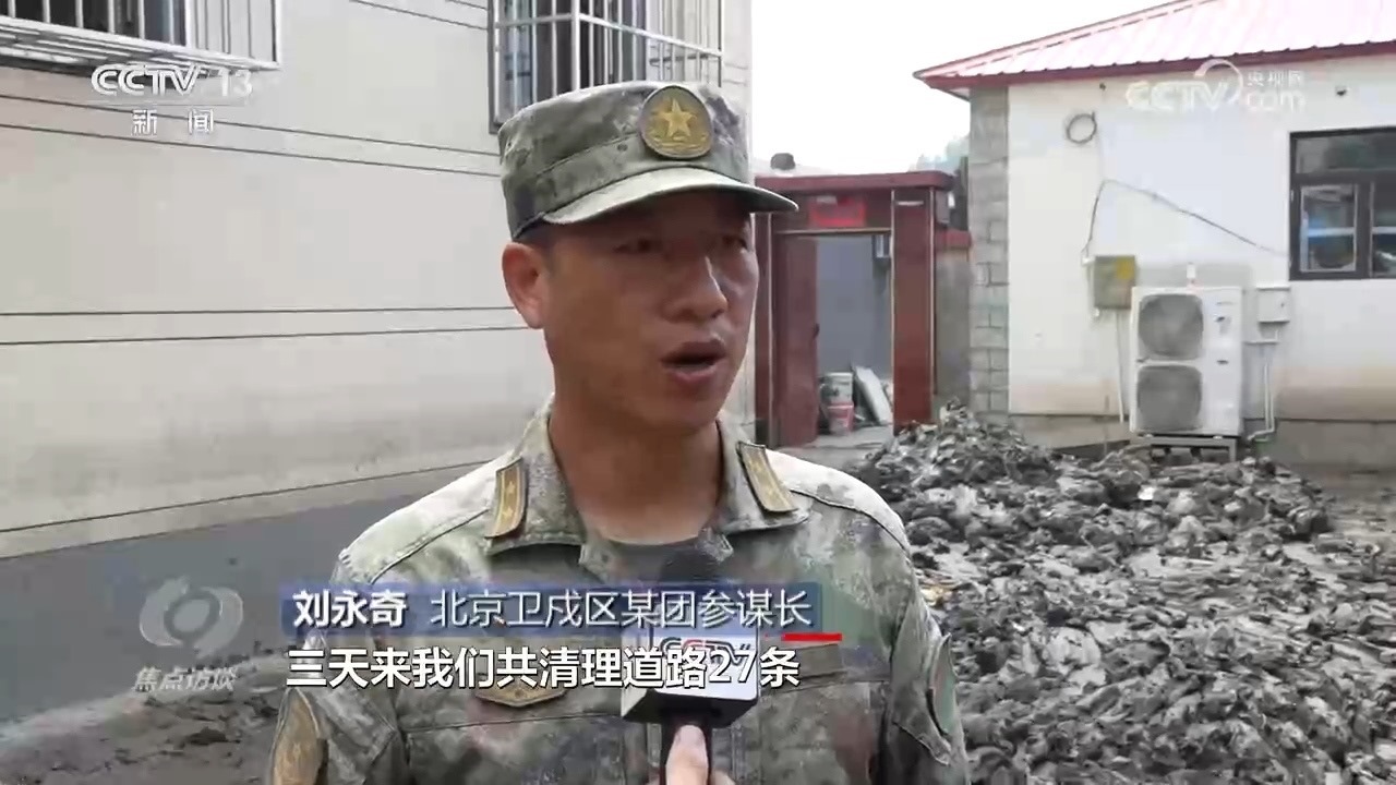 北京衛(wèi)戍區(qū)某團(tuán)參謀長(zhǎng)劉永奇:“三天來,我們共清理道路27條,面積28000余平方米,淤泥700余立方米,廢舊垃圾1300余立方米,全面疏通了各條道路。”