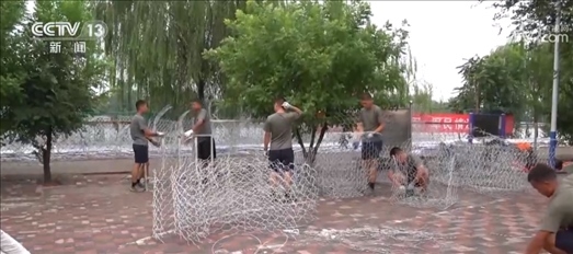 針對當前及未來幾天天津氣象變化,有效應對大清河兩側堤壩可能出現(xiàn)的險情,官兵們采取動態(tài)輪換的方式,除了巡堤排險就是制作防洪石籠。像這樣40米一卷的鉛絲網(wǎng)片,他們已經(jīng)用了幾百卷,做好的石籠有500多個。
