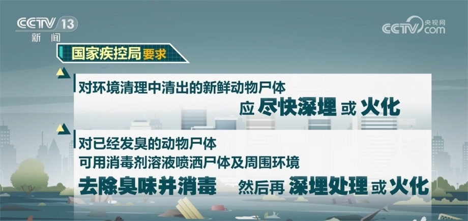 對環(huán)境清理中清出的新鮮動物尸體應盡快深埋或火化,對已經(jīng)發(fā)臭的動物尸體,可用消毒劑溶液噴灑尸體及周圍環(huán)境,去除臭味并消毒,然后再深埋處理或火化。