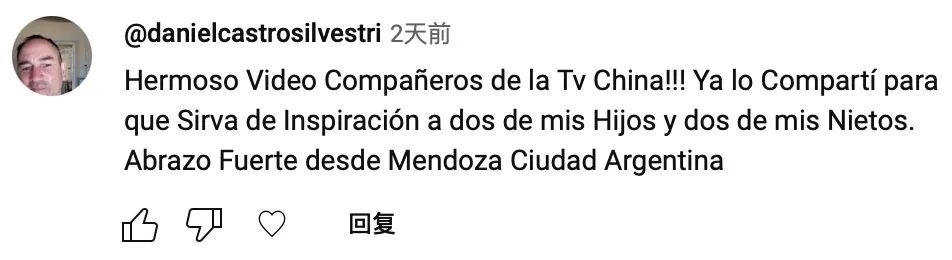 網(wǎng)友danielcastrosilvestri:“中國(guó)電視臺(tái)的朋友們,這個(gè)視頻太好看了?。?!我把它分享出去,希望它能夠給我的兩個(gè)孩子和兩個(gè)孫子帶來(lái)啟發(fā)。我來(lái)自阿根廷的門(mén)多薩市,致禮?!?/p>