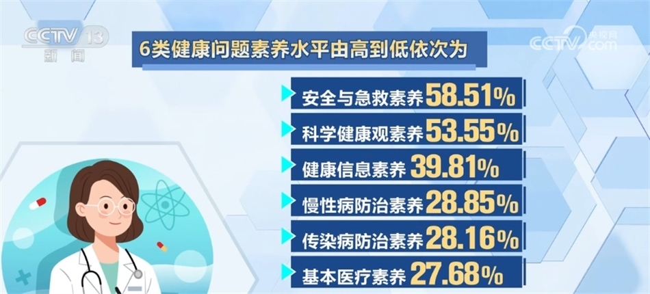 6類健康問題素養(yǎng)水平由高到低依次為:安全與急救素養(yǎng)58.51%、科學(xué)健康觀素養(yǎng)53.55%、健康信息素養(yǎng)39.81%、慢性病防治素養(yǎng)28.85%、傳染病防治素養(yǎng)28.16%和基本醫(yī)療素養(yǎng)27.68%。各類健康問題素養(yǎng)均有不同程度提升,其中,健康信息素養(yǎng)水平增幅最大,較2021年提升了3.88個(gè)百分點(diǎn)。本次監(jiān)測覆蓋31個(gè)?。ㄗ灾螀^(qū)、直轄市)的336個(gè)縣(區(qū))1008個(gè)鄉(xiāng)鎮(zhèn)(街道),對象為15—69歲常住人口。