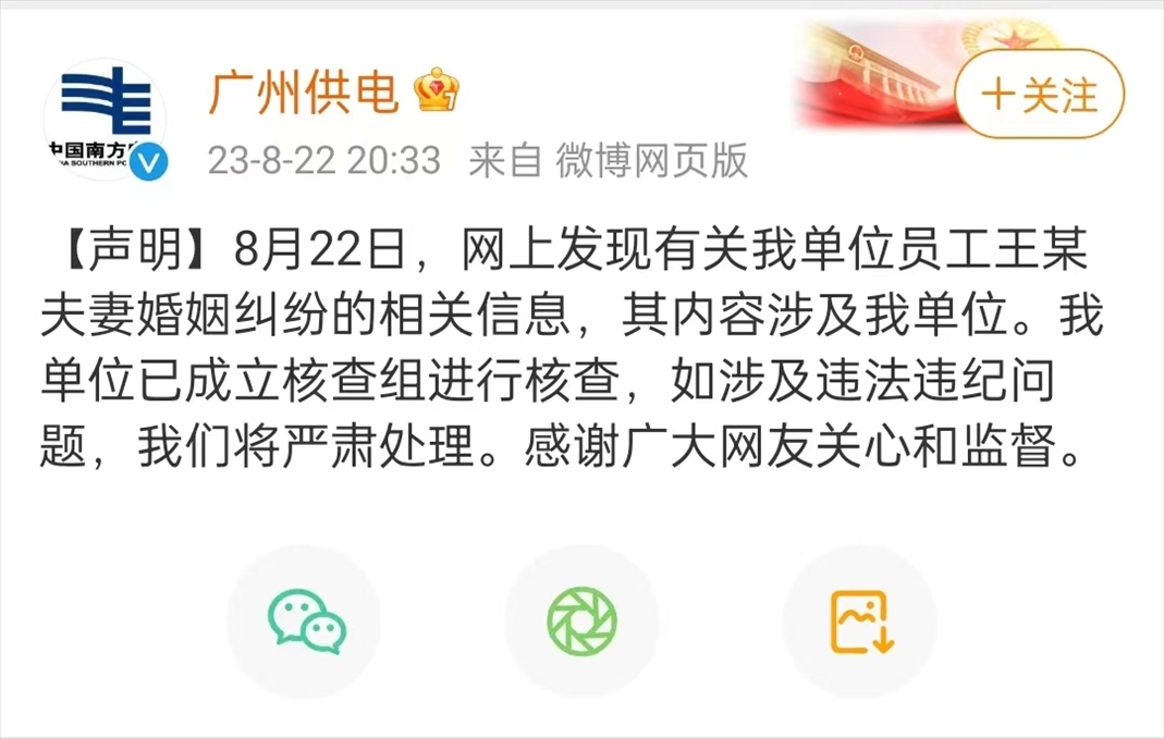·廣州供電局回應(yīng)員工遭妻子舉報(bào)行賄30萬入職:已成立核查組。