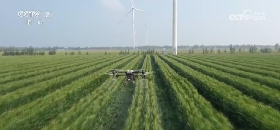 在山東省德州市武城縣,2萬畝復(fù)合種植的玉米和大豆長勢旺盛。李希軍2023年種植的1600多畝地,采用了玉米4行、大豆4行,兩種作物帶狀間作模式。他告訴記者,這段時間當(dāng)?shù)亟涤觐l繁,部分地塊出現(xiàn)褐斑病、玉米螟蟲等病蟲害。李希軍第一時間請來農(nóng)技人員和飛防隊進行針對性防控作業(yè)。