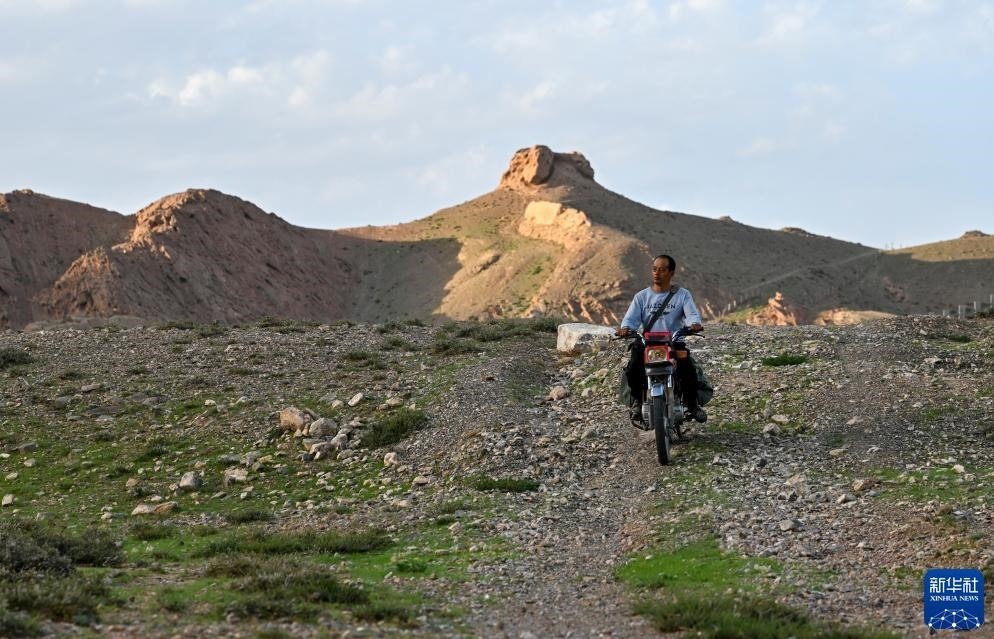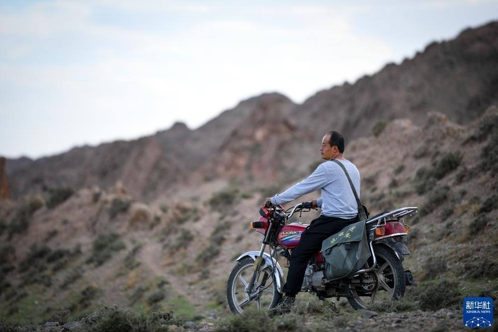 8月20日,董海寧騎摩托車巡查賀蘭山沿線的明長(zhǎng)城永寧段。新華社記者 馮開華 攝