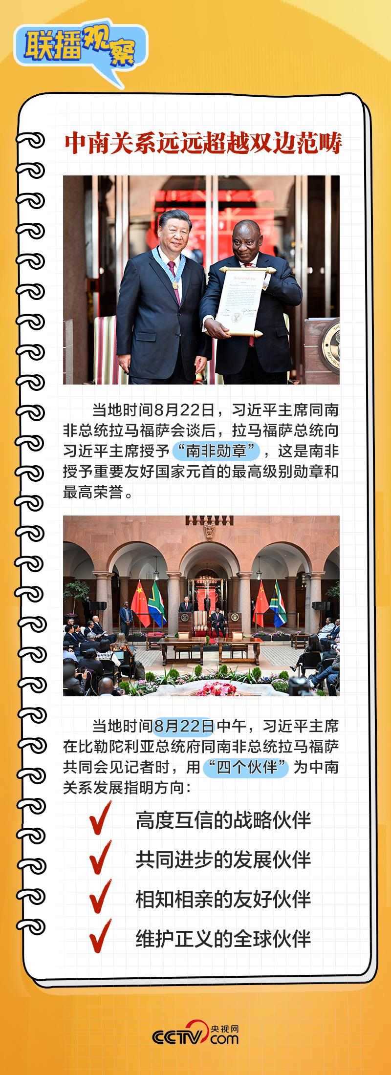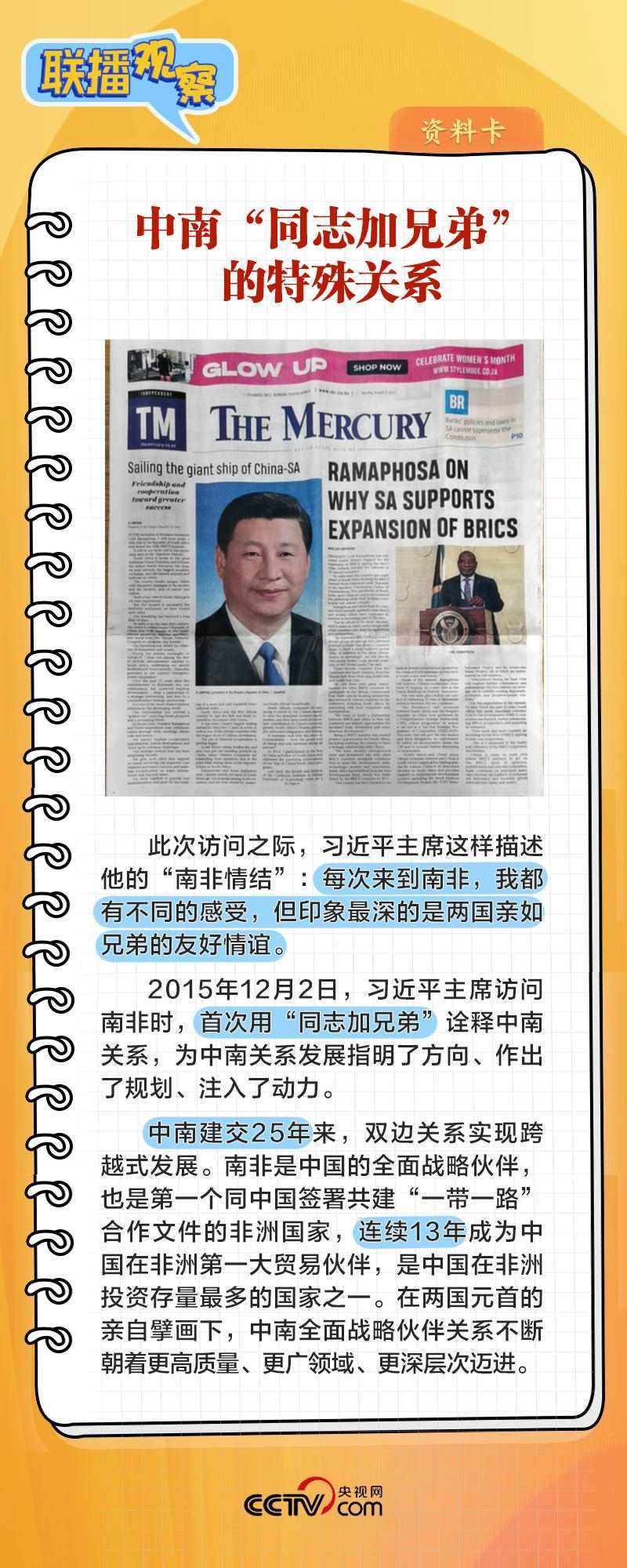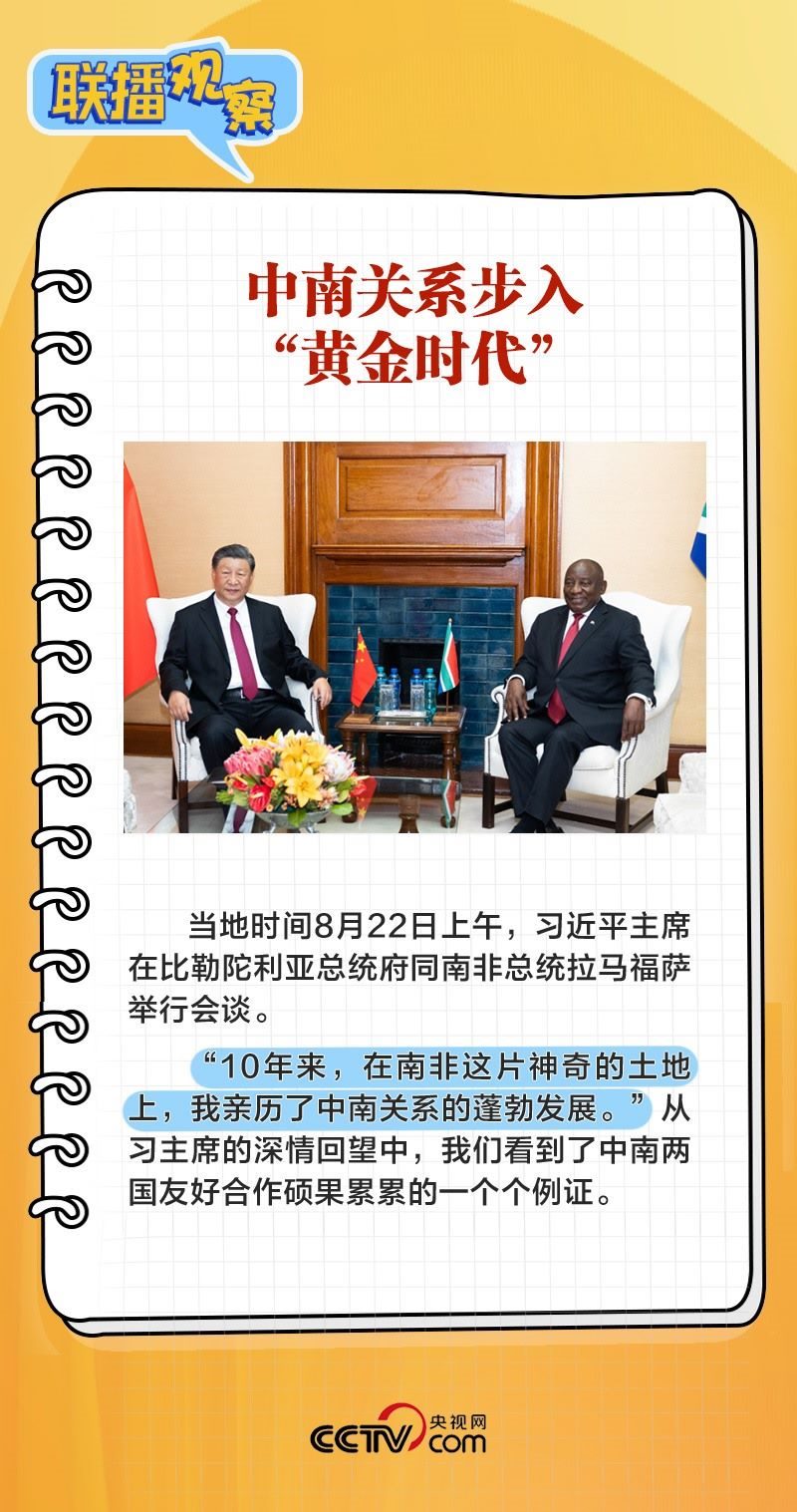 8月22日上午,在同南非總統(tǒng)拉馬福薩舉行會(huì)談時(shí),習(xí)主席表示:“中南關(guān)系之所以好、中南友誼之所以深,關(guān)鍵在于兩國兩黨在各自發(fā)展道路上休戚與共,結(jié)下了同志加兄弟的深厚友誼。”