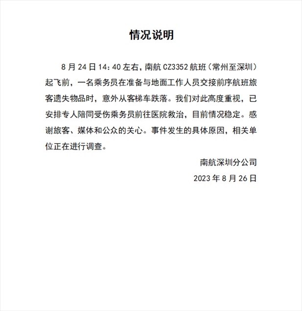 ·南航回應(yīng)“空乘跌落”:傷者情況穩(wěn)定,具體原因正在調(diào)查。