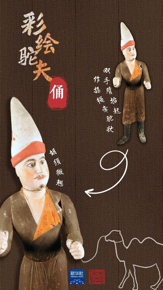 吐魯番阿斯塔那206號墓是唐代高昌左衛(wèi)大將軍張雄與妻子的合葬墓。墓中出土的木俑做工精湛,大多是由中原生產(chǎn),具有明顯的盛唐風(fēng)格,彩繪駝夫俑便出土于此。駝夫為胡人男子形象,深目高鼻,胡須微翹,頭戴高聳折沿白氈尖帽,身著褐色掩襟長袍,足穿高棱黑靴。此俑為分段雕刻膠合而成,再施以彩繪,面部表情富有神韻,惟妙惟肖。通過駝夫生動的神情仿佛看到他牽著駱駝,帶著各色商品,沿著絲綢之路慢慢走來。