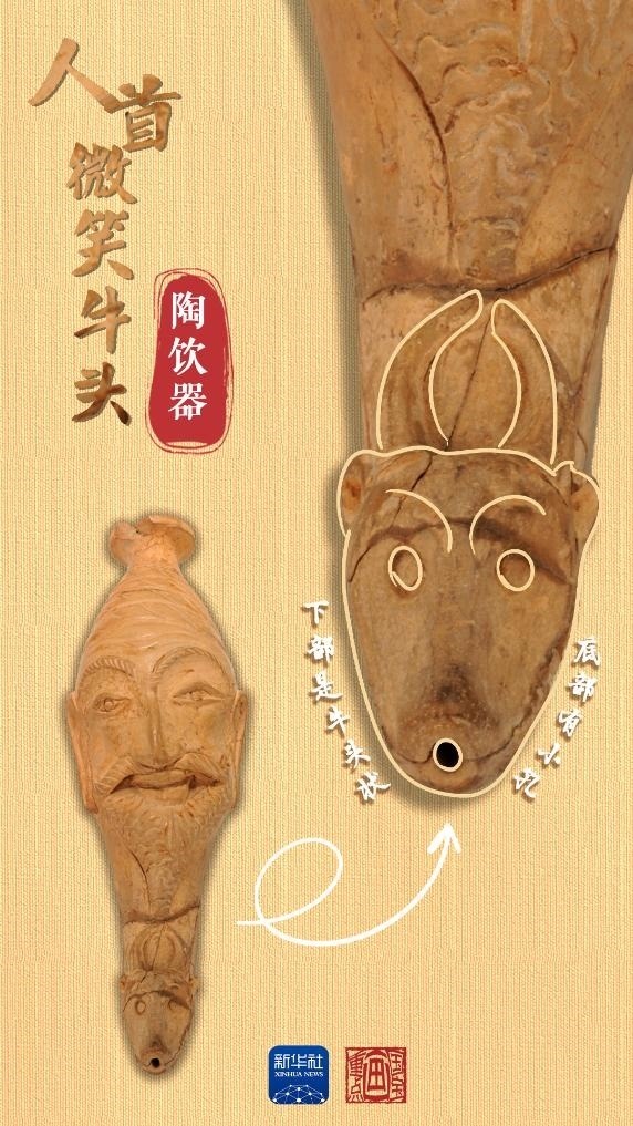 當(dāng)中國絲綢的美譽經(jīng)由古絲綢之路在西亞、歐洲等地傳揚時,西方文明也穿過風(fēng)沙與長歌,在中國留下了印記。人首微笑牛頭陶飲器出土于和田地區(qū)約特干遺址,為唐代時期文物。飲器上部為人首形,下部是牛頭狀,底部帶小圓孔,上下兩部分內(nèi)腔相通。人首上唇胡須外展卷翹,面帶微笑。牛頭微微上翹,牛角豎立攏圓。這種飲器造型源自“來通”,即末端為動物形或人首形的角杯,是小亞細亞和地中海地區(qū)常見的飲酒器具,絲綢之路沿線國家都有類似文物出土。