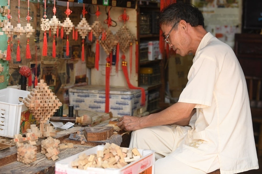 非遺傳承人在諸葛村制作孔明鎖(2023年8月1日攝)。新華社記者 翁忻旸 攝