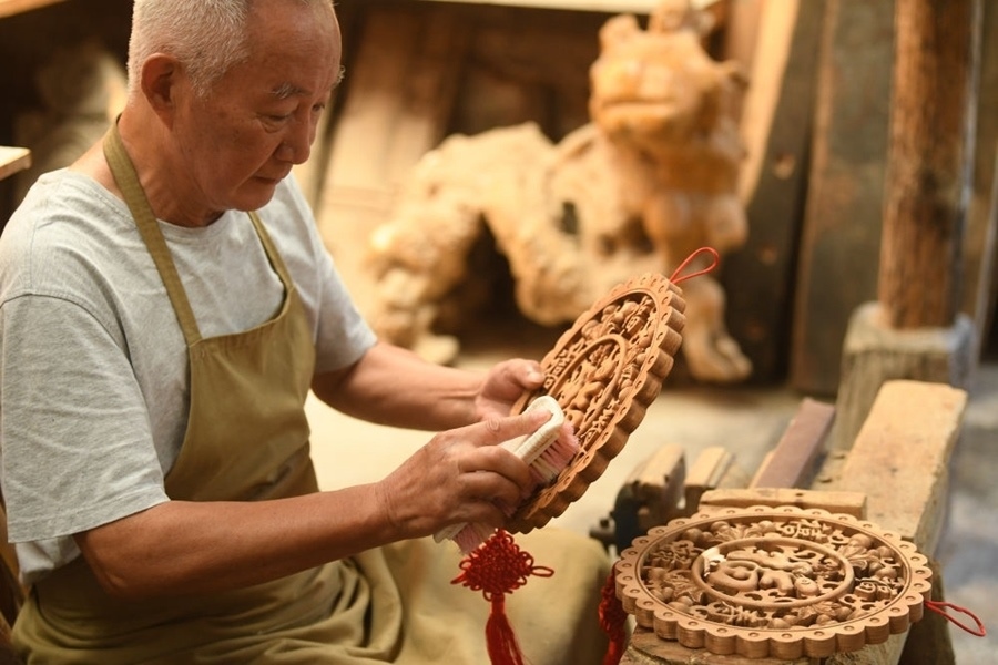 一名木工在諸葛村清理作品(2023年8月1日攝)。新華社記者 翁忻旸 攝