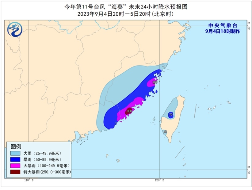 降水預(yù)報(bào):9月4日20時(shí)至5日20時(shí),福建大部、廣東東部、江西東南部、浙江東南部、臺(tái)灣島西部等地部分地區(qū)有大到暴雨,其中,福建東部、廣東東南部等地部分地區(qū)有大暴雨,局地特大暴雨(250-300毫米)。上述部分地區(qū)伴有短時(shí)強(qiáng)降水(最大小時(shí)降雨量30-50毫米,局地可超過(guò)70毫米),局地有雷暴大風(fēng)等強(qiáng)對(duì)流天氣。