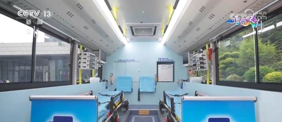 大型5G移動急救復蘇單元由兩輛公交車改裝而成,包含1輛急救治療車和1輛急救指揮車。急救治療車內(nèi)設有2個擔架位和1個搶救床位,可同時轉運多名危重病人。車內(nèi)配備了功能全面、集成度高的急救和轉運平臺,可以在車內(nèi)開展體外呼吸循環(huán)支持和緊急救命性手術等復雜急救手段。