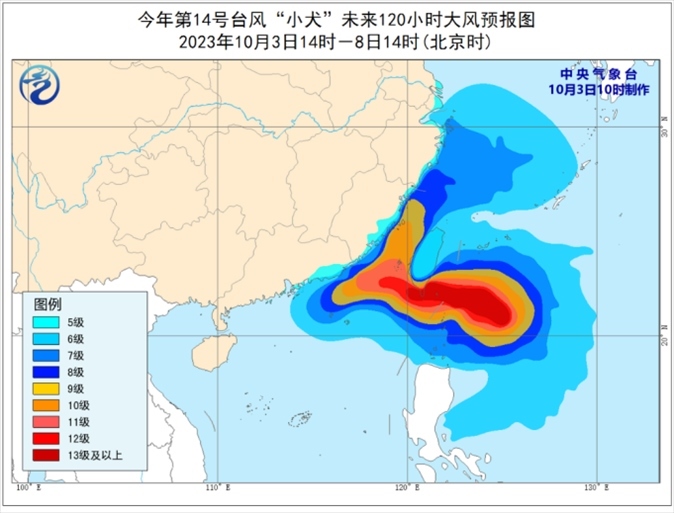 大風(fēng)預(yù)報(bào):3日下午至8日,臺(tái)灣以東洋面、巴士海峽、東海大部、臺(tái)灣海峽、南海東北部以及杭州灣、浙江沿海、福建沿海、廣東東南部沿海以及臺(tái)灣島沿海將有6~8級(jí)大風(fēng),其中,臺(tái)灣以東洋面、巴士海峽、臺(tái)灣海峽、南海東北部部分海面、福建沿海、廣東東南部沿海、臺(tái)灣島東南部和西部沿海的風(fēng)力將有9~12級(jí),“小犬”中心經(jīng)過(guò)的附近海面風(fēng)力可達(dá)13~16級(jí),陣風(fēng)17級(jí)。