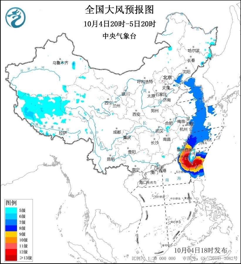 10月5日20時至6日20時,東海西南部海域、臺灣海峽、臺灣以東洋面偏南海域、巴士海峽偏北海域、南海東北部偏北海域?qū)⒂?~8級、陣風(fēng)9~10級的大風(fēng),其中臺灣海峽、南海東北部的部分海域風(fēng)力可達(dá)9~10級、陣風(fēng)11~12級,臺風(fēng)“小犬”中心經(jīng)過的附近海域風(fēng)力可達(dá)11~12級、陣風(fēng)13級;西藏西部、浙江沿海、福建沿海、臺灣島將有5~6級、陣風(fēng)7級的大風(fēng)。