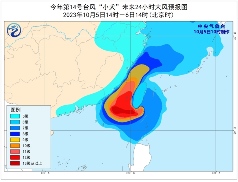 大風(fēng)預(yù)報(bào):5日14時(shí)至6日14時(shí),東海大部及釣魚(yú)島附近海域、臺(tái)灣以東洋面、巴士海峽、臺(tái)灣海峽、南海東北部以及浙江沿海、福建沿海、廣東東部沿海、臺(tái)灣島沿海將有6-8級(jí)、陣風(fēng)9-10級(jí)的大風(fēng),其中巴士海峽北部海面、臺(tái)灣海峽、臺(tái)灣島南部及沿海風(fēng)力將有9-12級(jí)、陣風(fēng)12-13級(jí),“小犬”中心經(jīng)過(guò)的附近海面風(fēng)力可達(dá)13-14級(jí),陣風(fēng)15-16級(jí)。
