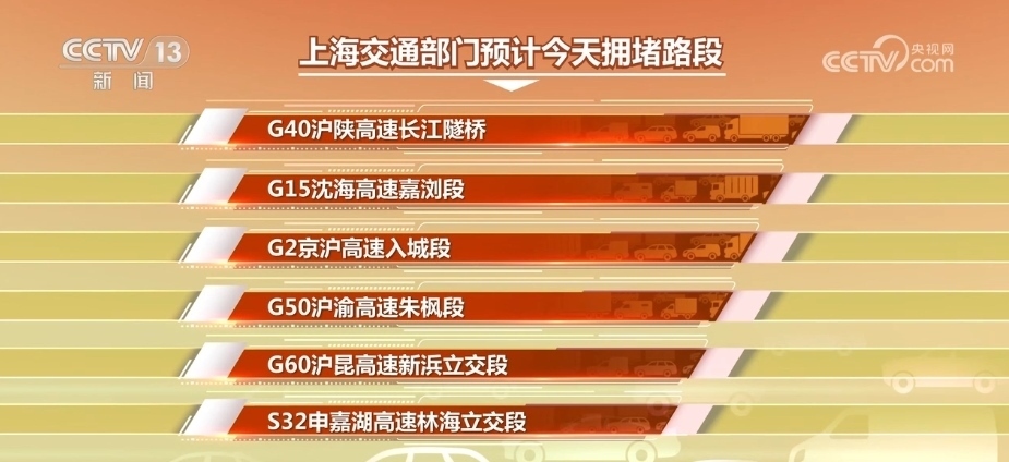 上海交通部門預(yù)計(jì),返程高峰期間,G40滬陜高速長(zhǎng)江隧橋、G15沈海高速嘉瀏段、G2京滬高速入城段、G50滬渝高速朱楓段、G60滬昆高速新浜立交段、S32申嘉湖高速林海立交段等入城方向?qū)a(chǎn)生一定擁堵。