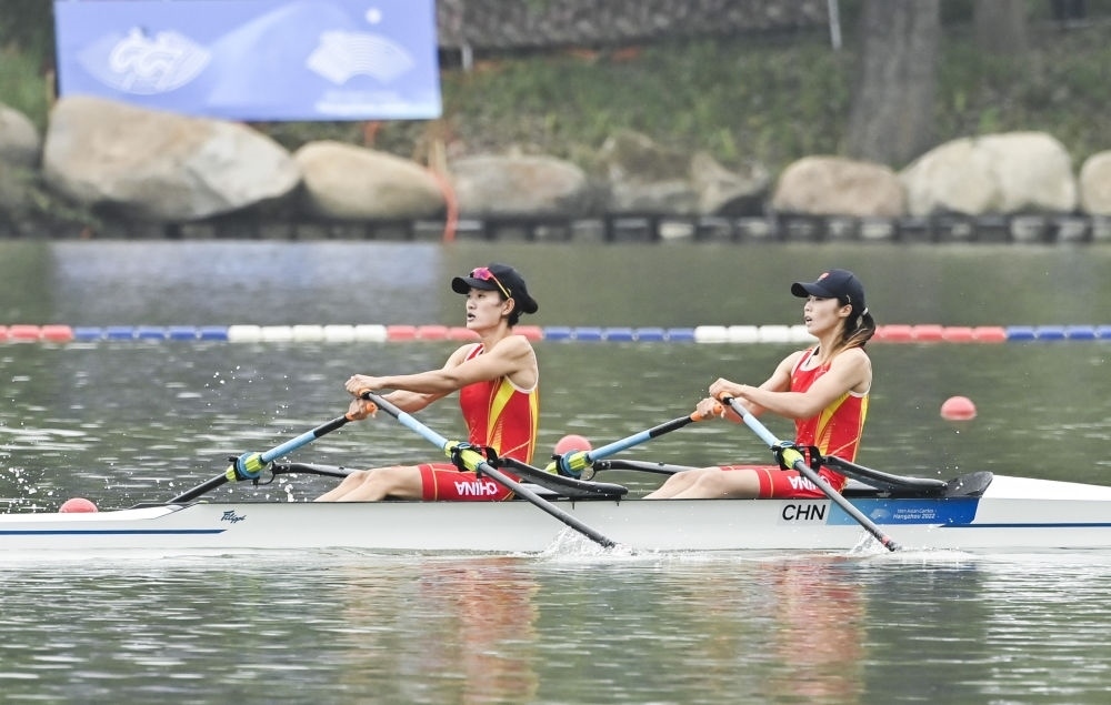 9月24日,在杭州亞運會賽艇女子輕量級雙人雙槳決賽中,中國組合鄒佳琪/邱秀萍以7分06秒78的成績奪得冠軍,斬獲本屆亞運會首金。這是鄒佳琪(右)/邱秀萍在決賽中。新華社記者 江漢 攝