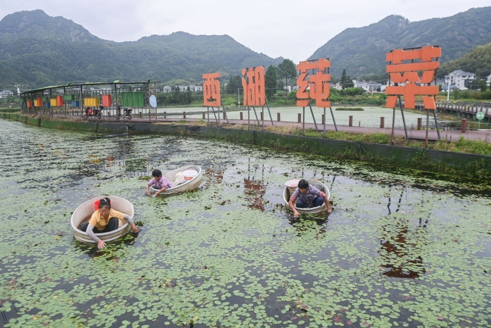 9月5日,在浙江省建德市航頭鎮(zhèn)烏龍村莼菜基地,村民劃著“盆船”在西湖莼菜產業(yè)園種植基地的水面上采摘西湖莼菜。近年來,浙江建德市航頭鎮(zhèn)以黨建聯建為紐帶,圍繞轄區(qū)特色農業(yè)產業(yè)園建設,發(fā)揮新鄉(xiāng)賢、鄉(xiāng)土人才、農創(chuàng)客作用,在烏龍村投資600余萬元新建了占地1900平方米的西湖莼菜產業(yè)園,引導新鄉(xiāng)賢爭當農業(yè)致富帶頭人,打造西湖莼菜共富工坊。新華社記者 徐昱 攝