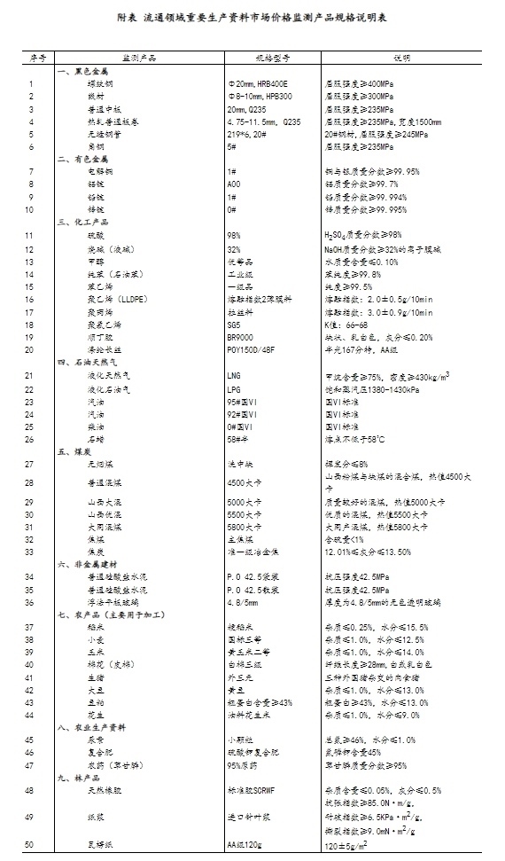 流通領(lǐng)域重要生產(chǎn)資料市場(chǎng)價(jià)格監(jiān)測(cè)內(nèi)容包括9大類50種產(chǎn)品的價(jià)格。類別與產(chǎn)品規(guī)格說明詳見附表。