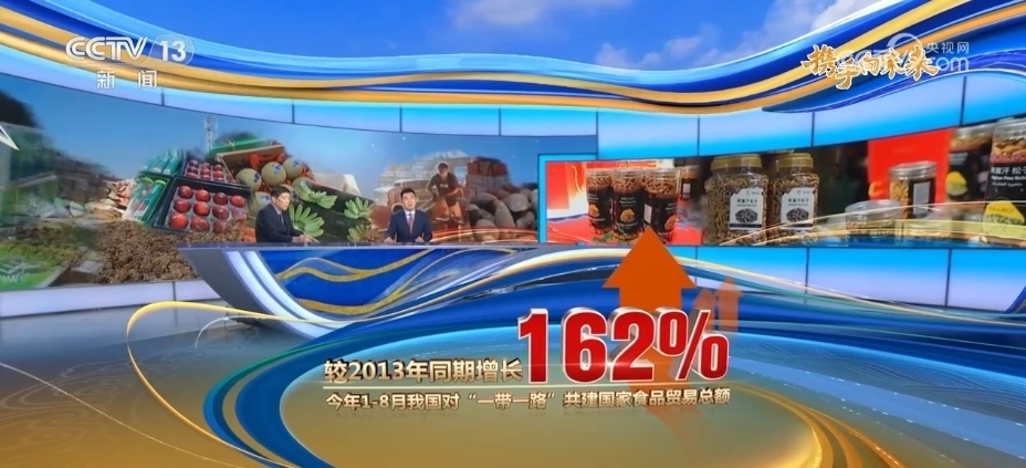 162%。2023年1—8月,我國對“一帶一路”共建國家食品貿(mào)易總額已經(jīng)達(dá)到5538.2億元,較2022年同期增長10.4%,較2013年同期增長達(dá)到了162%。