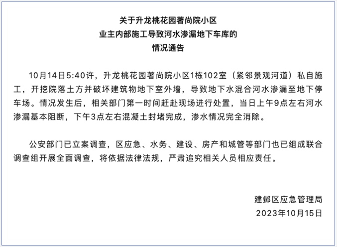 ·網(wǎng)傳南京一業(yè)主濫挖地下室致河水倒灌車庫,官方通報:多部門調(diào)查追責(zé)。