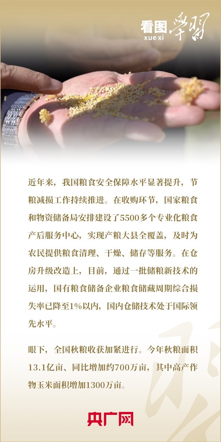 糧食安全是“國(guó)之大者”。黨的十八大以來(lái),習(xí)近平總書(shū)記在地方考察調(diào)研期間,常常走進(jìn)田間地頭,看長(zhǎng)勢(shì)、問(wèn)收成,多次強(qiáng)調(diào)“中國(guó)人的飯碗任何時(shí)候都要牢牢端在自己手中”,“保障糧食安全,要在增產(chǎn)和減損兩端同時(shí)發(fā)力”。讓14億多人吃飽吃好,總書(shū)記始終念茲在茲。今天是世界糧食日,一起來(lái)學(xué)習(xí)!