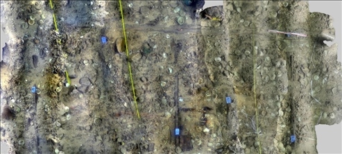 經(jīng)過調(diào)查,探明了一號、二號沉船遺址的分布范圍,在二處遺址核心堆積區(qū)的西南角布放水下測繪永久基點,完成了遺址三維激光掃描和一號沉船遺址核心區(qū)、環(huán)形散落區(qū)、部分條形散落區(qū)和二號沉船遺址核心區(qū)、散落區(qū)的攝影拼接,從一號沉船遺址提取出水文物標(biāo)本543件(套),二號沉船遺址提取出水遺物36件。