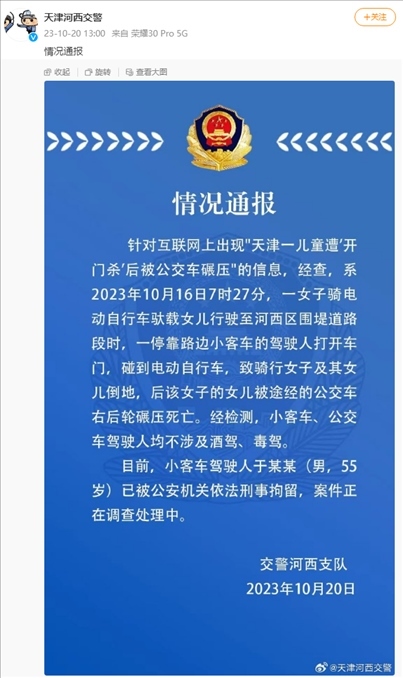 ·天津警方通報(bào)“兒童遭開門殺后被公交碾壓死亡”:小客車駕駛?cè)艘驯恍淌戮辛簦讣谡{(diào)查處理中。