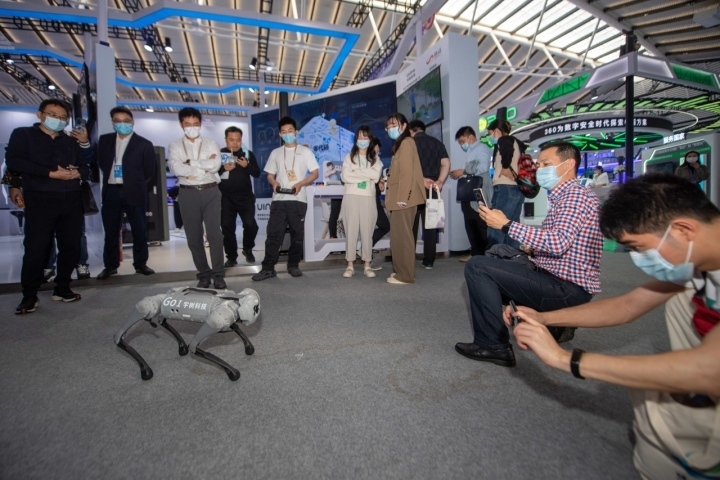 2022年11月10日,觀眾在“互聯(lián)網(wǎng)之光”博覽會(huì)上參觀機(jī)器狗表演。新華社