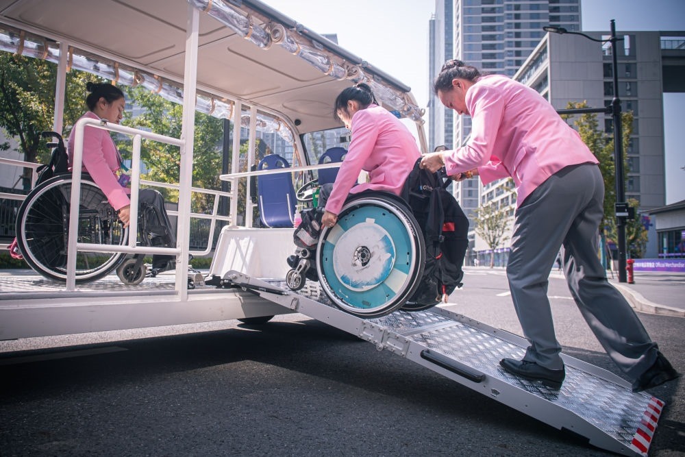 10月16日,中國體育代表團成員在杭州亞殘運村內(nèi)乘坐無障礙接駁車出行。新華社記者 江漢 攝