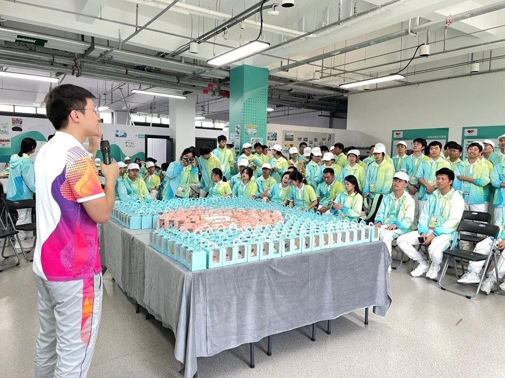在富陽水上運動中心,和他一樣參加杭州亞運會和亞殘運會志愿服務(wù)工作的同學還有300多名。因與“親和”諧音而被稱作“小青荷”的志愿者們,身著白綠相間的統(tǒng)一服裝,在青山綠水間上演著“小荷才露尖尖角”。