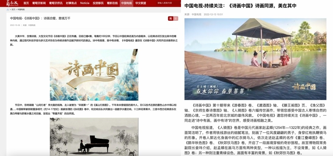 同時,《詩畫中國》在傳播上也達到了節(jié)目內外的同頻共振,成功讓華夏文明輻射至全世界。在美國《國際日報》網站和社交媒體賬號、法國《歐洲時報》網站和App、俄羅斯《龍報》網站和世界頭條App“北極熊視野”賬號等華文新媒體平臺上,節(jié)目相關內容廣受歡迎。在2022“非洲伙伴”媒體合作論壇上,《詩畫中國》還作為總臺優(yōu)秀作品進行了展示。日前于戛納影節(jié)宮舉辦的第六屆WISDOM in CHINA中國原創(chuàng)節(jié)目模式推介會上,節(jié)目更是以中國原創(chuàng)之名,登上了Mipcom主舞臺。