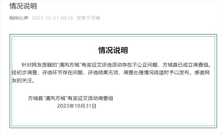 ·獲獎(jiǎng)?wù)魑?2篇為同一作者,官方通報(bào)調(diào)查結(jié)果:評選環(huán)節(jié)存在問題,評選結(jié)果無效。
