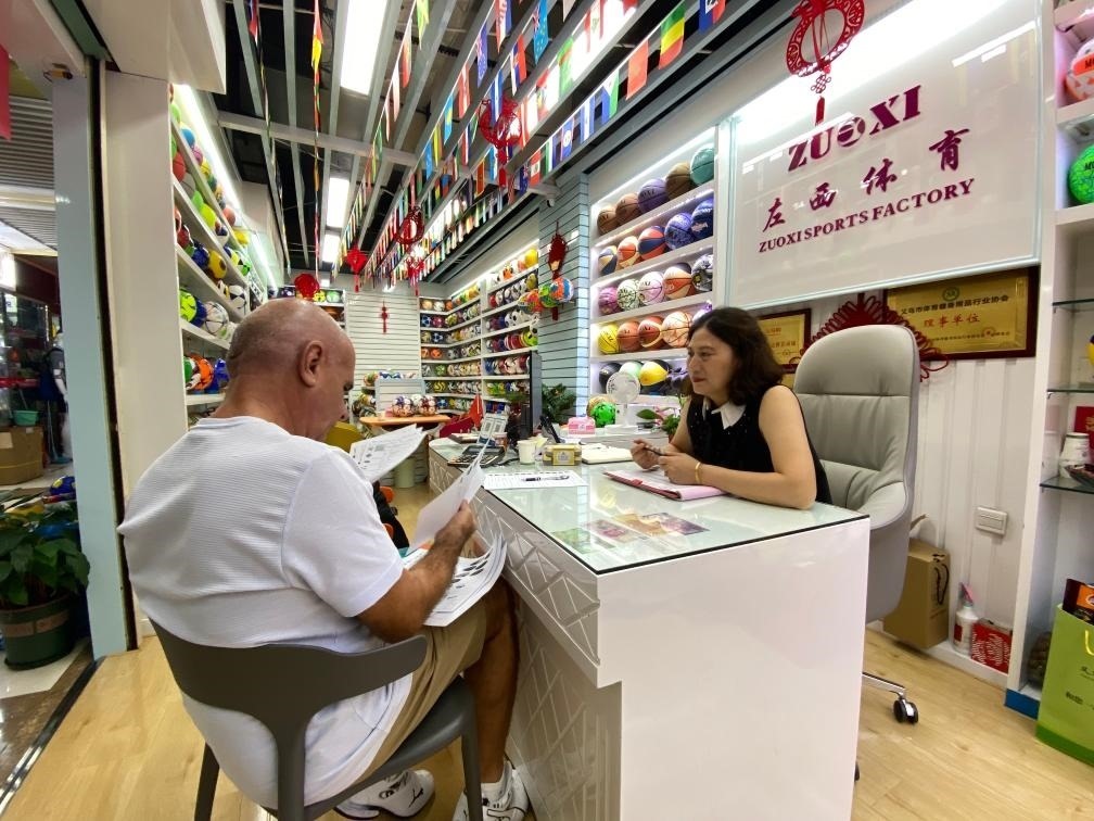 義烏國際商貿城內,經營戶正在與國外客戶洽談。新華社記者魏一駿 攝