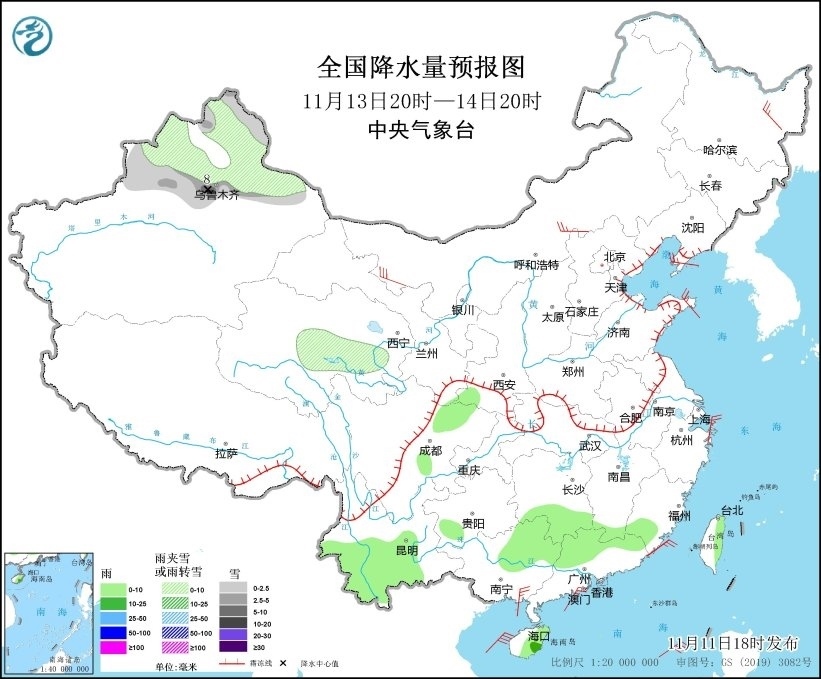 11月12日20時(shí)至13日20時(shí),新疆北部、甘肅南部等地部分地區(qū)有小雪或雨夾雪,其中,新疆阿勒泰和伊犁河谷等地部分地區(qū)有中到大雪(5~7毫米)。西南地區(qū)東南部、江南西部、華南西北部、海南島等地部分地區(qū)有小到中雨。內(nèi)蒙古中部、黑龍江東北部、遼東半島、山東半島、浙江東部、廣西東南部沿海等地部分地區(qū)有4~6級(jí)風(fēng)。渤海、黃海、東海大部海域以及臺(tái)灣海峽部分區(qū)域?qū)⒂?~8級(jí)風(fēng),陣風(fēng)可達(dá)9級(jí)(見圖5)。