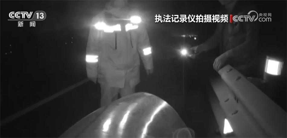 再來看前些天發(fā)生在京臺高速山東德州段的這一幕。晚上八點(diǎn)多,德州高速交警在轄區(qū)巡查時,發(fā)現(xiàn)在京臺高速往濟(jì)南方向的這一處內(nèi)側(cè)行車道上,掉落了一個大型管道,前方不遠(yuǎn)處有一輛大型貨車正停在應(yīng)急車道內(nèi),而貨車駕駛?cè)苏驹谥醒胱o(hù)欄內(nèi),用手電筒提醒過往車輛。由于晚上途經(jīng)的大都是大型車輛,夜間視距較差,情況十分危險(xiǎn),現(xiàn)場交警分工配合,通過多次嘗試終于跑到了遺落物的旁邊進(jìn)行處置。