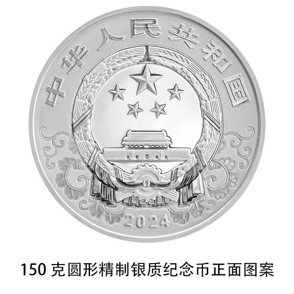 150克圓形銀質紀念幣為精制幣,含純銀150克,直徑70毫米,面額50元,成色99.9%,最大發(fā)行量8000枚。