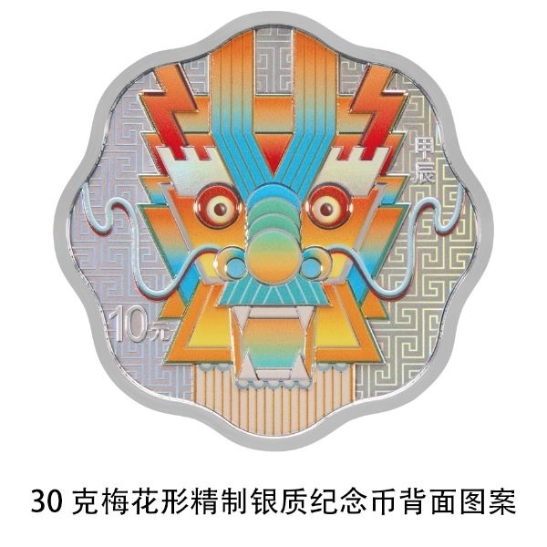 30克梅花形銀質紀念幣背面圖案為裝飾龍造型,襯以回紋紋飾。