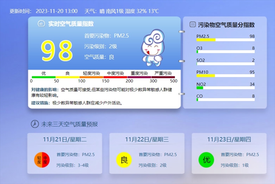 央視網(wǎng)消息:據(jù)@北京環(huán)境監(jiān)測(cè) 消息,11月20日13時(shí)的實(shí)時(shí)空氣質(zhì)量指數(shù),北京目前的污染級(jí)別達(dá)到2級(jí),東城、西城、朝陽(yáng)、豐臺(tái)、通州、房山、大興等區(qū)已顯示為輕度污染。